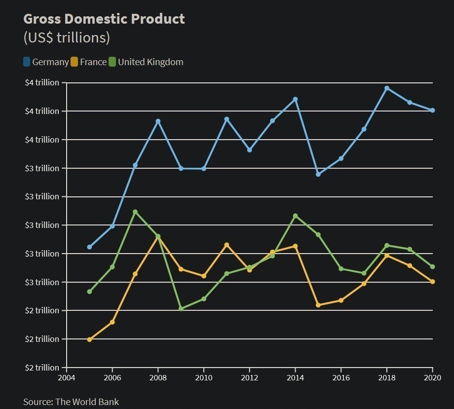 H γερμανική οικονομία βασίζεται στις εξαγωγές, ιδιαίτερα στις βιομηχανικές. Η οικονομία αυτή έχει επιδείξει σταθερή ανάπτυξη κατά τη διάρκεια της θητείας της Μέρκελ, σύμφωνα με το παρακάτω γράφημα, ξεπερνώντας τις αντίστοιχες οικονομίες της Βρετανίας και της Γαλλίας.