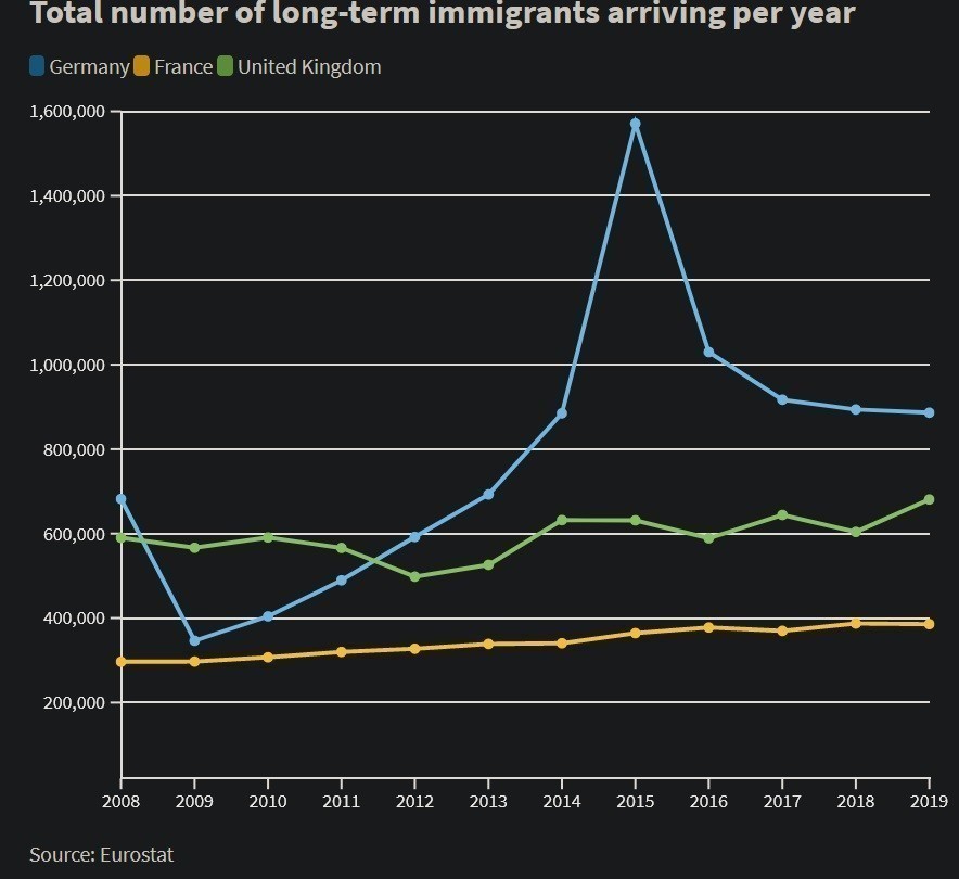 Η Μέρκελ αποφάσισε να κάνει το ακριβώς αντίθετο, υποδεχόμενη 1 εκατομμύριο πρόσφυγες και μετανάστες στη Γερμανία το 2015, σύμφωνα με τα παρακάτω στοιχεία της Eurostat.