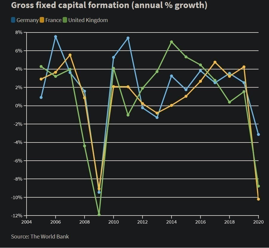 Το παρακάτω γράφημα του gross capital formation (προηγουμένως γνωστό ως gross domestic investment) δείχνει τη διαφορά των δημόσιων επενδύσεων σε υποδομές στις τρεις ευρωπαϊκές χώρες.