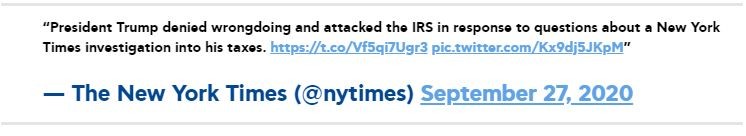 «Οι Νιού Γιορκ Τάιμς εξασφάλισαν φορολογικές δηλώσεις 20 και πλέον ετών τόσο του κ. Τραμπ όσο και των εκατοντάδων εταιρειών που συγκροτούν τον επιχειρηματικό οργανισμό του, συμπεριλαμβανομένων λεπτομερών πληροφοριών για τα δύο πρώτα χρόνια του στην εξουσία. Δεν περιλαμβάνονται οι φορολογικές δηλώσεις του ή τα ατομικά του εισοδήματα το 2018 ή το 2019», αναφέρει η εφημερίδα, η οποία υπόσχεται νέες αποκαλύψεις τις επόμενες ημέρες.