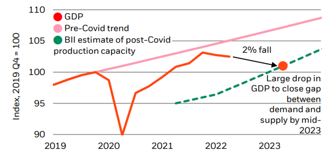 Βάσει του σχετικού πίνακα, οι αναλυτές τονίζουν πως ο μόνος τρόπος μείωσης του πληθωρισμού από τη Fed είναι η απότομη αύξηση των επιτοκίων. Aυτή με τη σειρά της θα δημιουργήσει μείωση της ζήτησης κατά 2% στα τρέχοντα επίπεδα παραγωγής της οικονομίας τα οποία είναι πολύ χαμηλότερα από τα αντίστοιχα πριν την πανδημία. Η BlackRock αναμένει πως εάν η ζήτηση μειωθεί κατά 2%, περίπου 3 εκατομμύρια Αμερικανοί θα μείνουν άνεργοι.