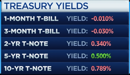 Οι αποδόσεις των εντόκων γραμματίων ενός μήνα και τριμήνων υποχώρησαν κάτω από το μηδέν την Τετάρτη, μια εβδομάδα και μισό, μετά την απόφαση της Ομοσπονδιακής Τράπεζας (Fed) να μειώσει το επιτόκιο σχεδόν στο μηδέν.