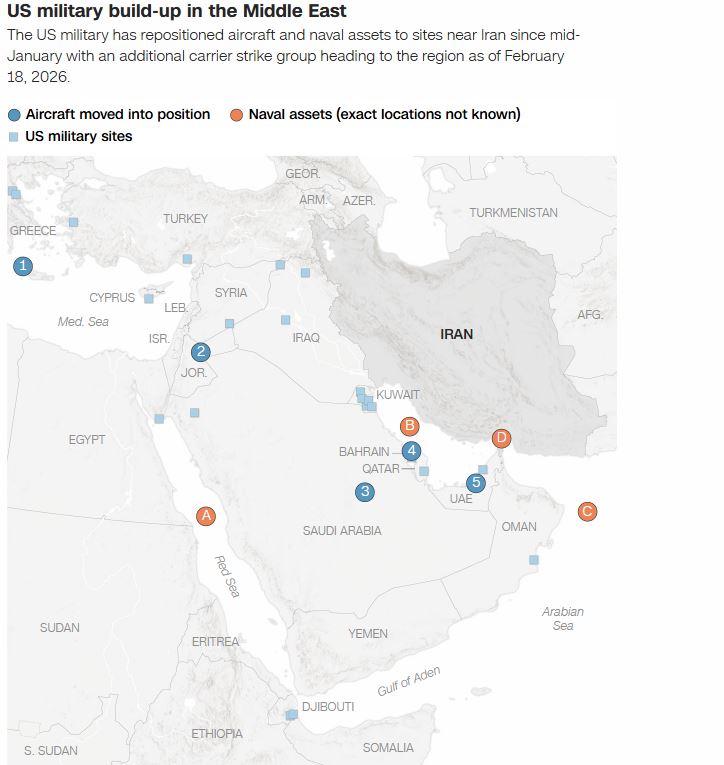 Η Ουάσιγκτον συνεχίζει να στέλνει στη Μέση Ανατολή πολεμικά πλοία και στρατιωτικά αεροσκάφη κατά δεκάδες. Έχει πλέον αναπτύξει δεκάδες χιλιάδες στρατιώτες σε βάσεις σε όλη την περιοχή–κάποιες από τις οποίες θα μπορούσαν να αποδειχθούν ευάλωτες σε περίπτωση ιρανικών αντιποίνων.
