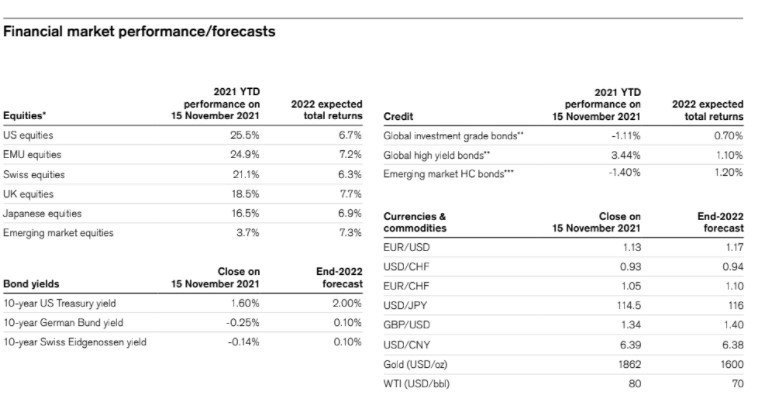 Σύμφωνα με τις επενδυτικές προοπτικές της Credit Suisse για το 2022, η παγκόσμια οικονομία αναμένεται να αναπτυχθεί κατά 4,3%. Αν και αρκετές κεντρικές τράπεζες έχουν αρχίσει να αποσύρουν τα δημοσιονομικά κίνητρα, τα επιτόκια θα παραμείνουν στο μηδέν ή κοντά στο μηδέν στις μεγάλες ανεπτυγμένες οικονομίες. Σε αυτό το πλαίσιο, οι αποδόσεις των μετοχών αναμένεται να παραμείνουν ελκυστικές, αν και είναι πιθανό να είναι πιο συγκρατημένες από πέρυσι.
