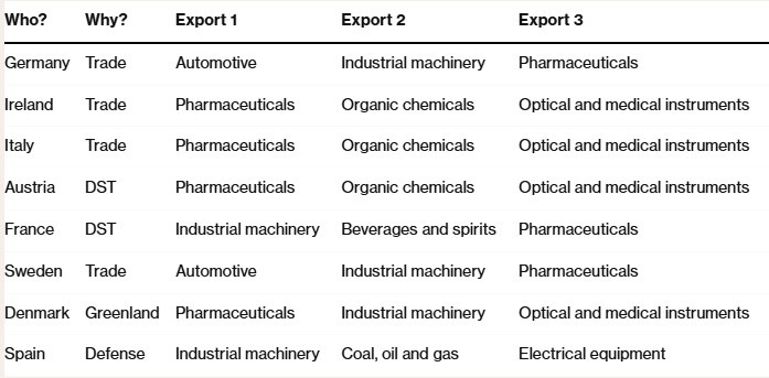Τα τρία κύρια ζητήματα του Τραμπ με την Ευρώπη είναι τα εμπορικά πλεονάσματα, οι φόροι ψηφιακών υπηρεσιών και οι αμυντικές δαπάνες. Υπό αυτό το πρίσμα, οι αναλυτές του Bloomberg Economics επικαλούνται οκτώ χώρες στις οποίες θα μπορούσε να επικεντρωθεί, συμπεριλαμβανομένων της Γερμανίας, της Ιρλανδίας και της Ιταλίας, και στη συνέχεια μελέτησαν τις κύριες εξαγωγές τους στις ΗΠΑ.