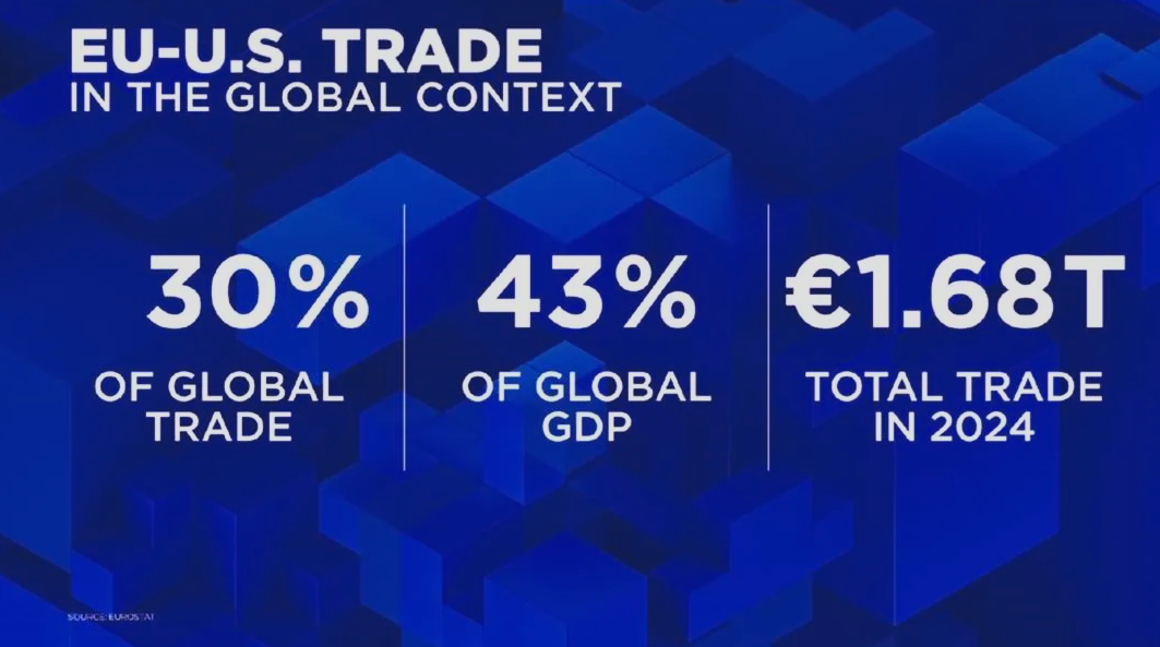 Οι ΗΠΑ και η ΕΕ έχουν τις μεγαλύτερες διμερείς εμπορικές και επενδυτικές σχέσεις στον κόσμο, αντιπροσωπεύοντας σχεδόν το 30% του παγκόσμιου εμπορίου αγαθών και υπηρεσιών και το 43% του παγκόσμιου ακαθάριστου εγχώριου προϊόντος (ΑΕΠ), σύμφωνα με στοιχεία της ΕΕ.
