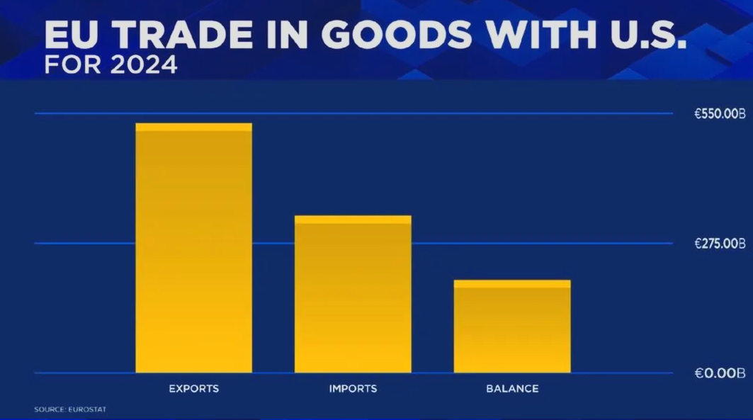 Μόνο πέρυσι, η αξία του εμπορίου μεταξύ ΕΕ και ΗΠΑ ανήλθε σε 1,68 τρισεκατομμύρια ευρώ (1,96 τρισεκατομμύρια δολάρια). Αυτό ισοδυναμεί με περίπου 4,6 δισεκατομμύρια ευρώ εμπορίου την ημέρα. Ο Τραμπ έχει επανειλημμένα επιτεθεί στην ΕΕ για αυτό που θεωρεί άδικες εμπορικές σχέσεις, αναφέροντας συχνά το εμπορικό πλεόνασμα της ΕΕ έναντι των ΗΠΑ.