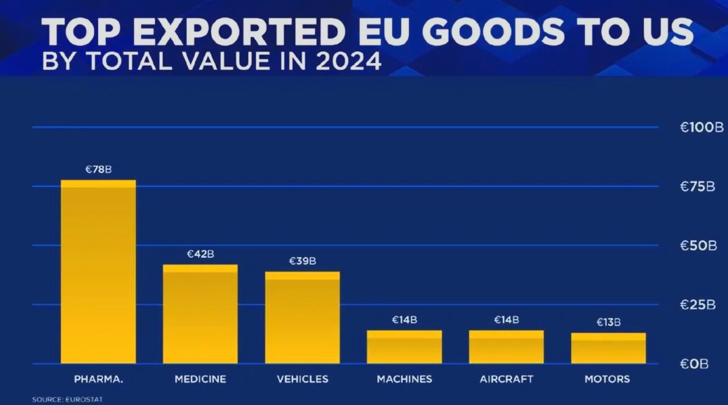 Λαμβάνοντας υπόψη τόσο το εμπόριο όσο και τις υπηρεσίες, το συνολικό εμπορικό πλεόνασμα της ΕΕ με τις ΗΠΑ ανήλθε σε 50 δισεκατομμύρια ευρώ το 2024, ποσό που, σύμφωνα με την ΕΕ, αντιπροσωπεύει λιγότερο από το 3% του συνολικού εμπορίου ΗΠΑ-ΕΕ.