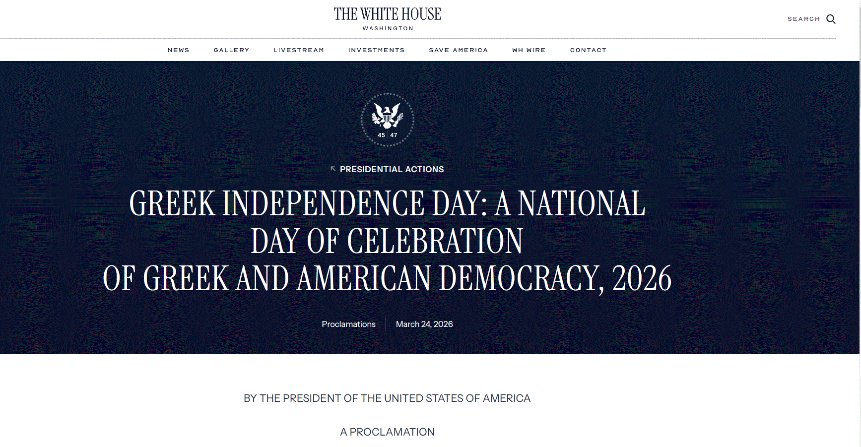 Όπως επισημαίνεται, η διακήρυξη εκδόθηκε δυνάμει της εξουσίας που παρέχουν στον πρόεδρο το Σύνταγμα και οι νόμοι των Ηνωμένων Πολιτειών, με τον κ. Τραμπ να ανακηρύσσει επισήμως την 25η Μαρτίου 2026 ως Ημέρα της Ελληνικής Ανεξαρτησίας και να καλεί τους πολίτες να την τιμήσουν με τις αρμόζουσες τελετές και δραστηριότητες. Η διακήρυξη φέρει ημερομηνία 24 Μαρτίου 2026, έτος κατά το οποίο συμπληρώνονται 250 χρόνια από την ανεξαρτησία των ΗΠΑ.