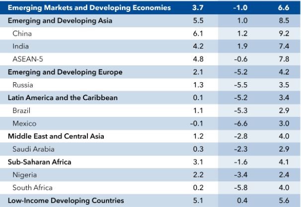 Το Ταμείο εκτιμά ότι οι προηγμένες οικονομίες θα συρρικνωθούν περισσότερο κατά 6,1%. Οι αναπτυσσόμενες οικονομίες και οι αναπτυσσόμενες οικονομίες θα σημειώσουν πτώση κατά 1%. Η ανάπτυξη στην Κίνα και την Ινδία θα επιβραδυνθεί, αλλά οι οικονομίες τους θα εξακολουθήσουν να αυξάνονται κατά 1,2% και 1,9% αντίστοιχα, ανέφερε το Ταμείο.
