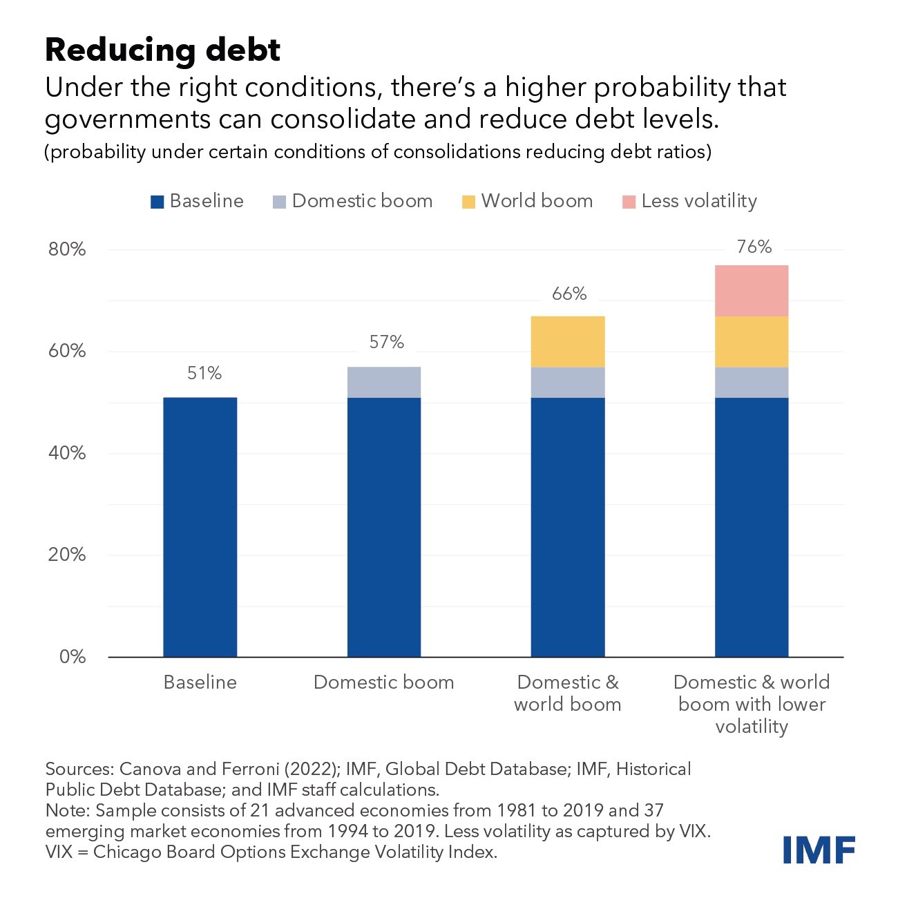 Στις ανεπτυγμένες οικονομίες, οι περικοπές δαπανών είναι πιθανότερο να μειώσουν τους δείκτες χρέους από ό,τι η αύξηση των εσόδων. Οι πιθανότητες επιτυχίας βελτιώνονται επίσης όταν η δημοσιονομική εξυγίανση ενισχύεται από διαρθρωτικές μεταρρυθμίσεις που ενισχύουν την ανάπτυξη και από ισχυρά θεσμικά πλαίσια.