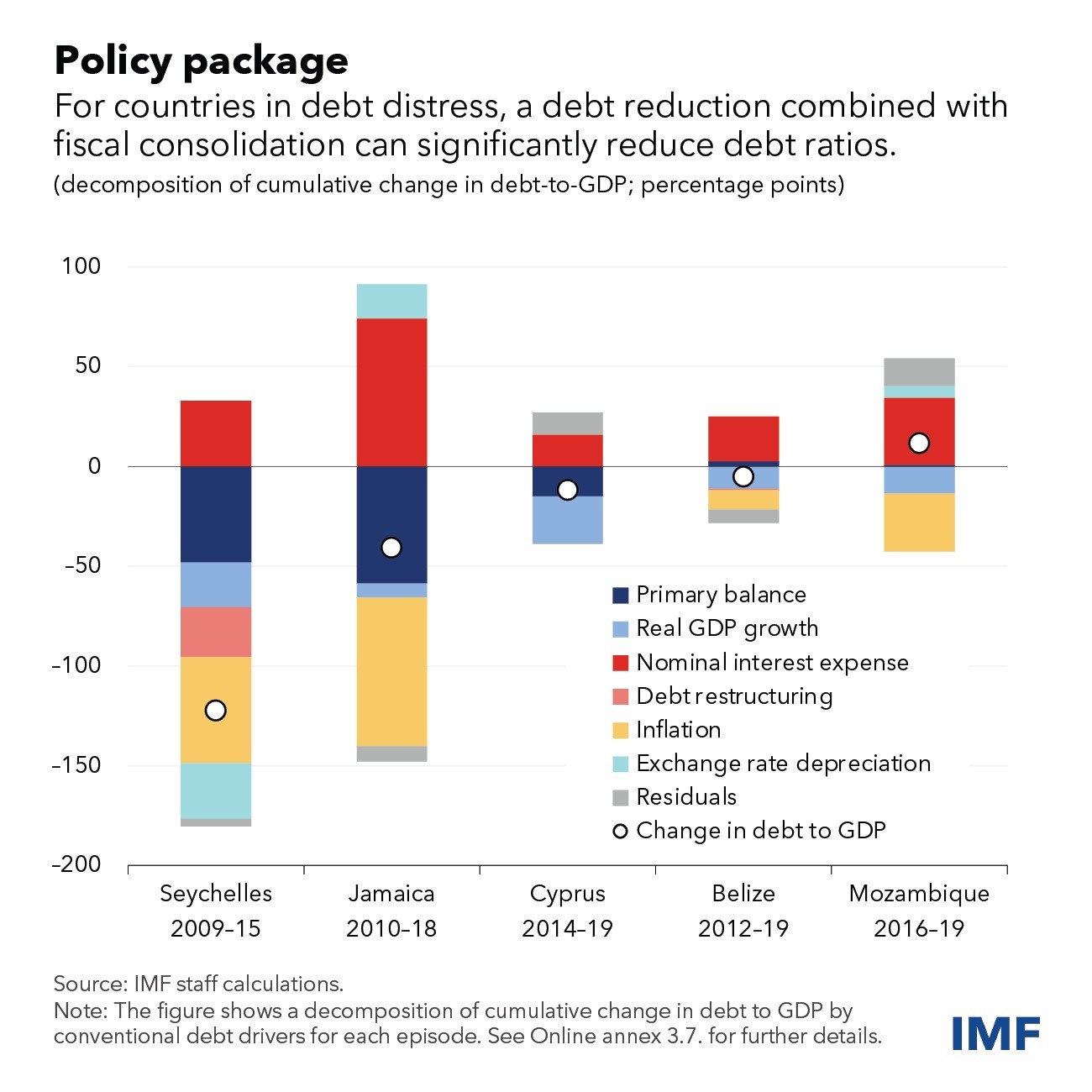 Η έκθεση αναφέρει το παράδειγμα στις Σεϋχέλλες, όπου το κράτος είχε δείκτη χρέους άνω του 180% το 2008, όταν χτύπησε η παγκόσμια χρηματοπιστωτική κρίση. Μετά από αναδιαρθρώσεις του χρέους τόσο με επίσημους πιστωτές της Λέσχης του Παρισιού όσο και με ιδιώτες εξωτερικούς πιστωτές, ο λόγος αυτός μειώθηκε στο 84% το 2010.