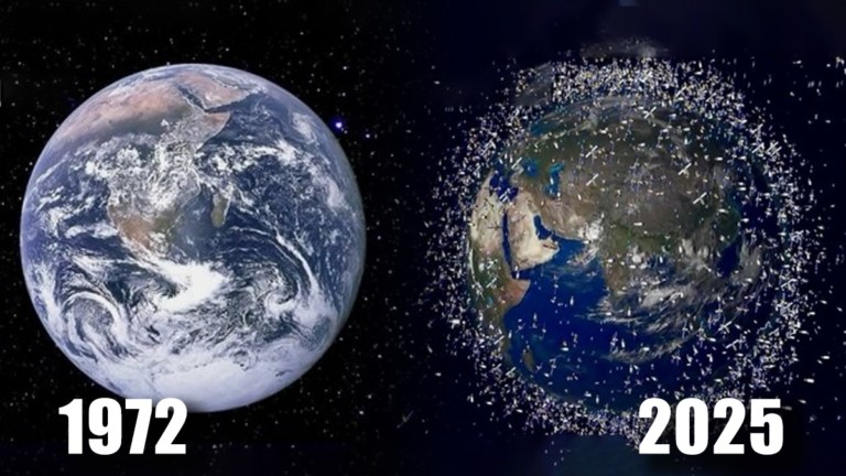 Ιδιαίτερα εντυπωσιακή είναι η εικόνα της Γης όπως καταγράφεται από το διάστημα, αποτυπώνοντας πώς έμοιαζε ο πλανήτης μας το 1972 και πώς έχει μεταβληθεί σήμερα, με χιλιάδες δορυφόρους να κινούνται διαρκώς στην τροχιά του.