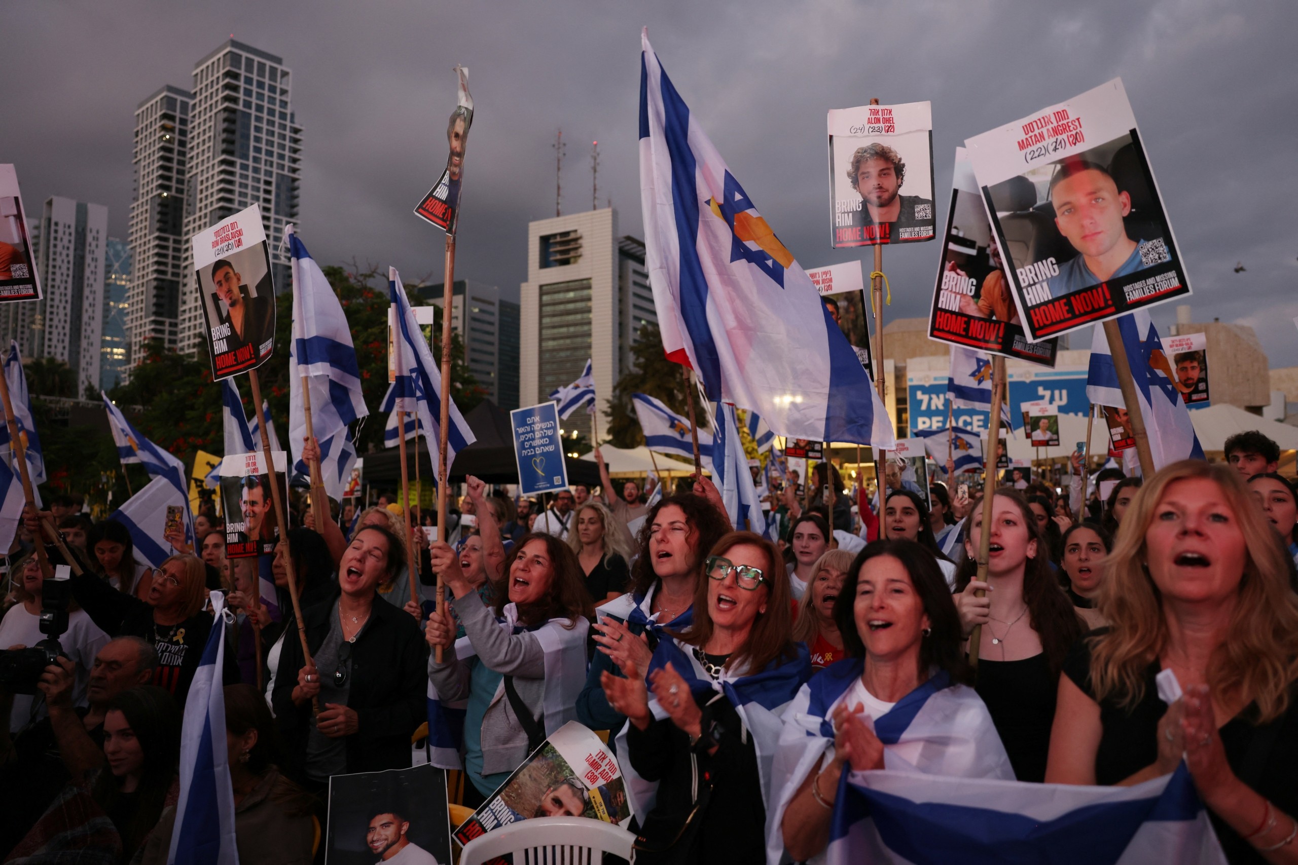 Η πλατεία, που εδώ και πάνω από 700 ημέρες αποτελεί το επίκεντρο των διαδηλώσεων για τους ομήρους, γέμισε από κόσμο που τραγουδούσε καθισμένος μαζί μπροστά στη μεγάλη οθόνη, όπου θα μεταδοθεί η επιστροφή των ομήρων από τη Γάζα.