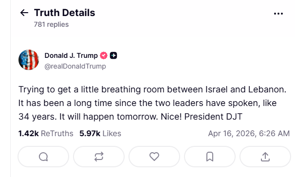 «Προσπαθώ να δημιουργήσω λίγο χώρο για να ανασάνουν το Ισραήλ και ο Λίβανος. Έχει περάσει πολύς καιρός που οι δυο ηγέτες δεν έχουν μιλήσει, κάπου 34 χρόνια. Αυτό θα γίνει αύριο. Ωραία!», ανέφερε ο πρόεδρος των ΗΠΑ μέσω Truth Social.