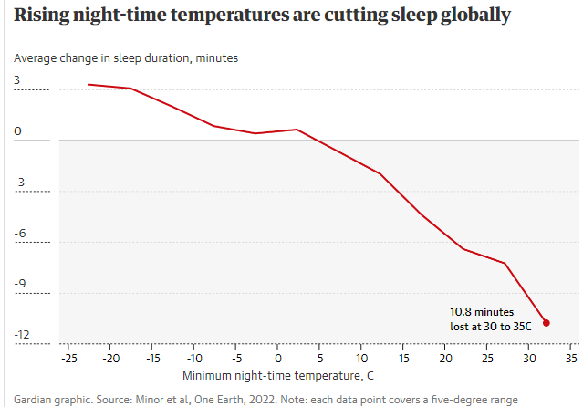 Η άνοδος της θερμοκρασίας λόγω της κλιματικής κρίσης μειώνει τον ύπνο των ανθρώπων σε όλο τον κόσμο, σύμφωνα με νέα μελέτη. Ο καλός ύπνος είναι ζωτικής σημασίας για την υγεία και την ευεξία, ωστόσο καθώς αυξάνονται οι νυχτερινές θερμοκρασίες, ακόμη πιο γρήγορα από ό,τι την ημέρα, ο ύπνος γίνεται όλο και πιο δύσκολος.