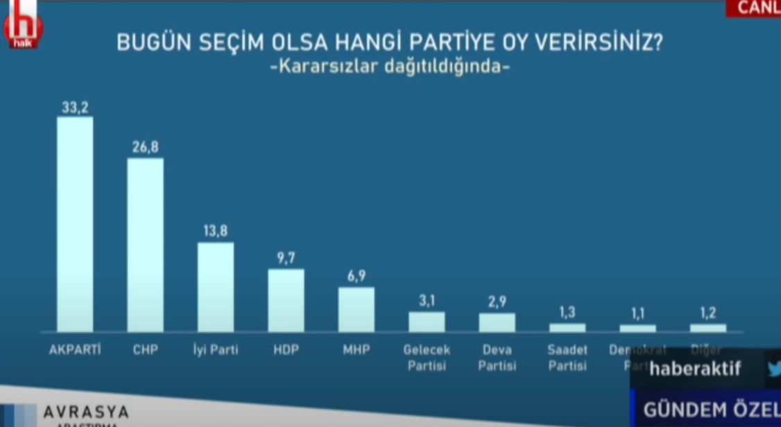Όπως δείχνει η δημοσκόπηση, την οποία διενήργησε η Avrasya, αν γίνονταν εκλογές στην Τουρκία αυτό το διάστημα η αντιπολίτευση θα ανέβαινε στην εξουσία αν συμμαχούσε με κάποιο άλλο κόμμα.