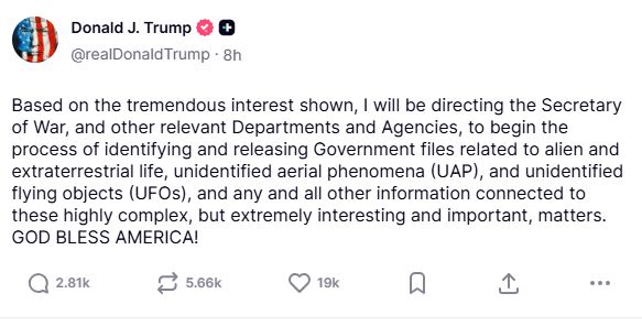 Την Πέμπτη 19 Φεβρουαρίου, μέσα από το Air Force One, ο Τραμπ διεμήνυσε ότι οι ομοσπονδιακές υπηρεσίες οφείλουν πλέον να παρουσιάσουν στο κοινό ό,τι διαθέτουν: από ανεξήγητα εναέρια φαινόμενα (UAP) μέχρι «άγνωστα αντικείμενα» που παραμένουν στα αζήτητα της ιστορίας.