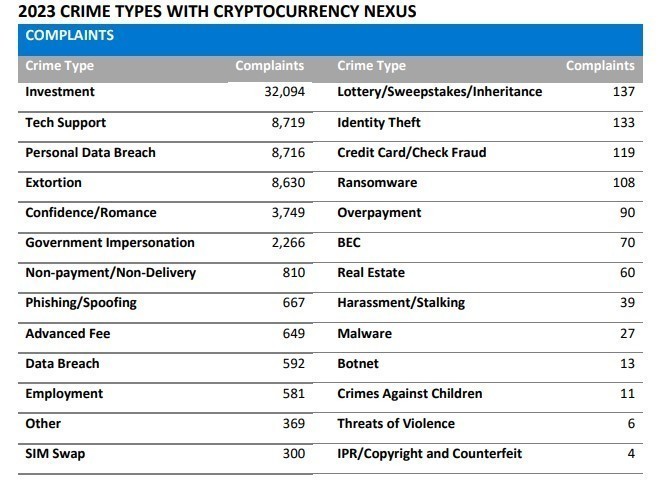 Συνολικά το 2023 το FBI έγινε αποδέκτης 70.000 καταγγελιών από θύματα απάτης που σχετίζονταν με ψηφιακά νομίσματα, κυρίως bitcoin και ether. Οι πιο συχνές περιπτώσεις απάτης είχαν να κάνουν με επενδύσεις, που ανέρχονταν σε απώλειες ύψους 3,96 δισ. δολαρίων.