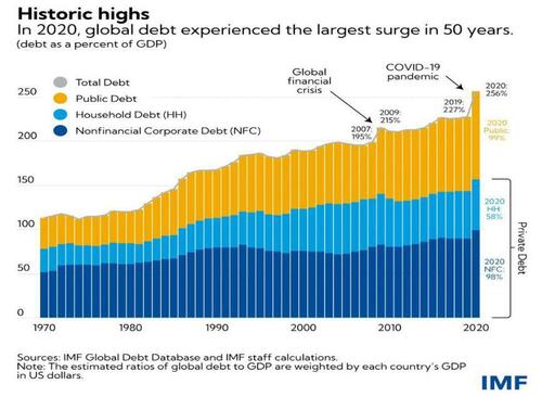 Το 2021 το παγκόσμιο χρέος έφτασε τα $303 τρισ., σύμφωνα με το Institute of International Finance, ξεπερνώντας κατά πολύ τα αντίστοιχα $226 τρισ του 2019.