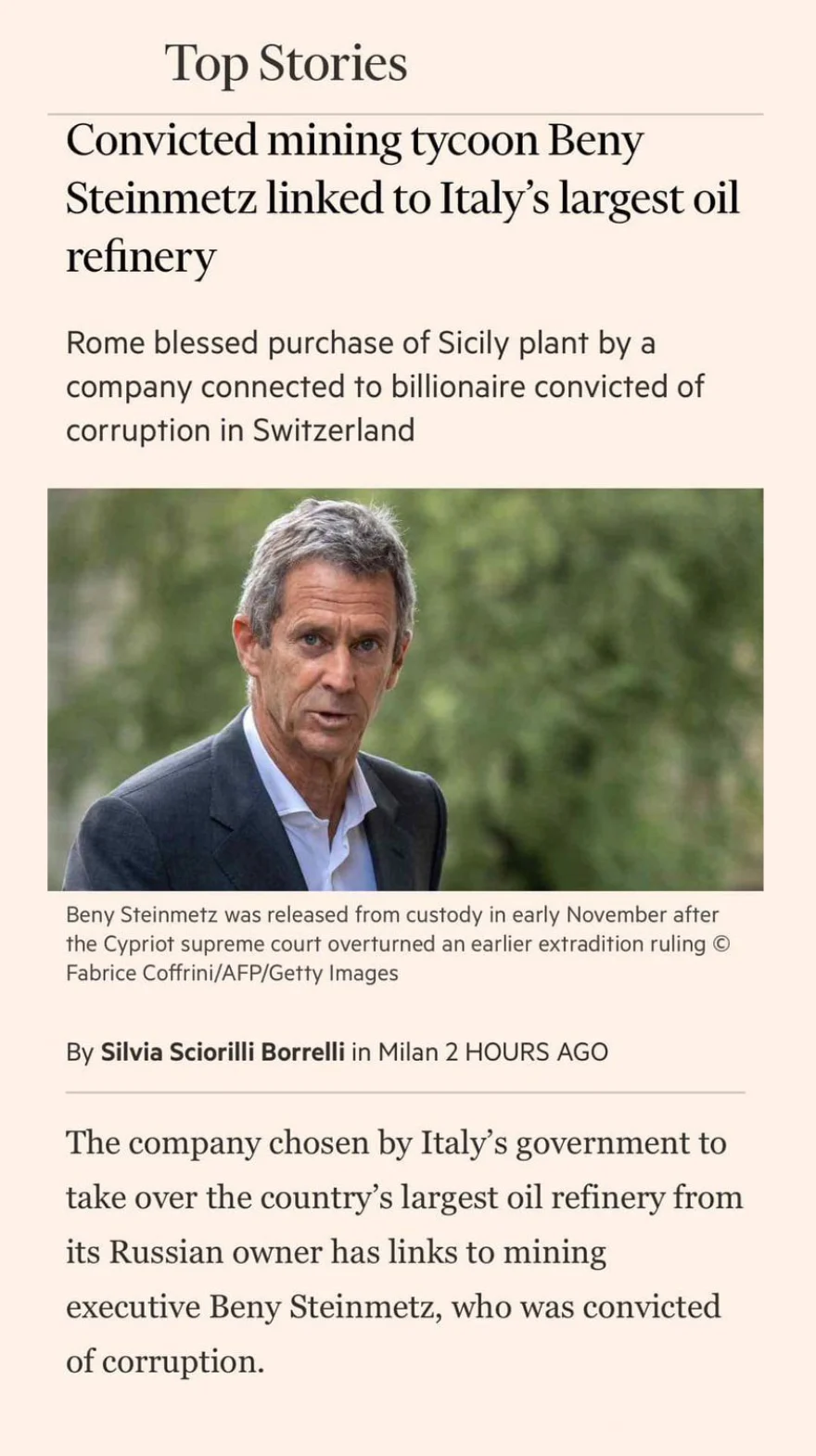 «Δεσμούς με τον καταδικασμένο για υποθέσεις διαφθοράς ισραηλινό επιχειρηματία, Μπένι Στάινμετζ είχε η εταιρεία που επέλεξε η ιταλική κυβέρνηση για να εξαγοράσει το μεγαλύτερο διυλιστήριο της χώρας από τη ρωσική εταιρεία Lukoil.