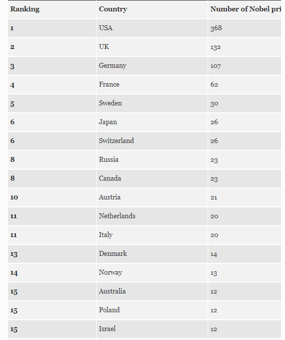 Στη λίστα με τις κορυφαίες χώρες και τα περισσότερα βραβεία Νόμπελ – η Δύση φαίνεται να είναι ασταμάτητη. Αυτό όμως ίσως και να αλλάξει μέσα στα επόμενα χρόνια καθώς η Ασία είναι πολλά υποσχόμενη. Διαθέτει πολύ καλές επιδόσεις μέχρι στιγμής σε όλες τις κατηγορίες.