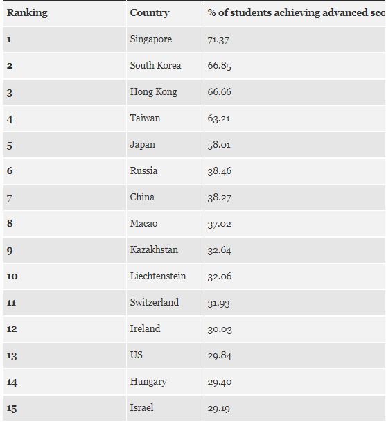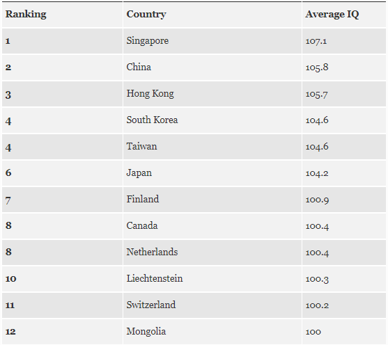 Καμία μεγάλη έκπληξη, δεδομένης και της λίστας με τις χώρες που έχουν τον υψηλότερο δείκτη IQ παγκοσμίως. Η Ασία κυριολεκτικά σαρώνει αφού καταλαμβάνει και τις 5 πρώτες θέσεις με την Ρωσία να βρίσκεται στην έκτη.