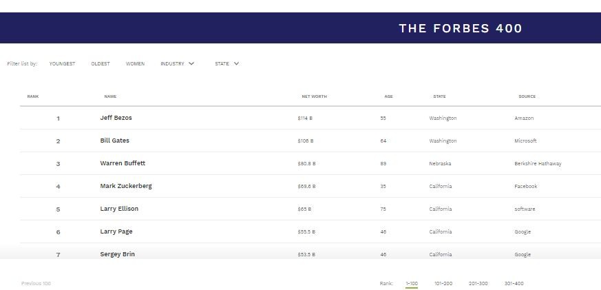 Ο ιδρυτής και διευθύνων σύμβουλος του Amazon, Jeff Bezos, διατηρεί την πρώτη θέση στη λίστα ως ο πλουσιότερος άνθρωπος στην Αμερική για δεύτερη συνεχόμενη χρονιά παρά το γεγονός ότι έχασε το ένα τέταρτο του ποσοστού του στην Amazon μετά το πολύκροτο διαζύγιο του. Η συνολική του περιουσία ανέρχεται σε 114 δισεκατομμύρια δολάρια, από 160 δισεκατομμύρια δολάρια πριν από ένα χρόνο. Η πρώην σύζυγός του, Mackenzie Bezos, συγκαταλέγεται στη λίστα για πρώτη φορά καταλαμβάνοντας τη θέση 15, με την περιουσία της να υπολογίζεται στα 36,1 δισεκατομμυρία δολάρια. Ο Bill Gates καταλαμβάνει τη δεύτερη θέση όπως και πέρισυ αλλά η διαφορά του με τον Bezos έχει μειωθεί σημαντικά, σε μόλις 8 δισεκατομμύρια δολάρια (σύμφωνα με τα στοιχεία του Forbes στις 6 Σεπτεμβρίου, οπότε και έκλεισε η λίστα).