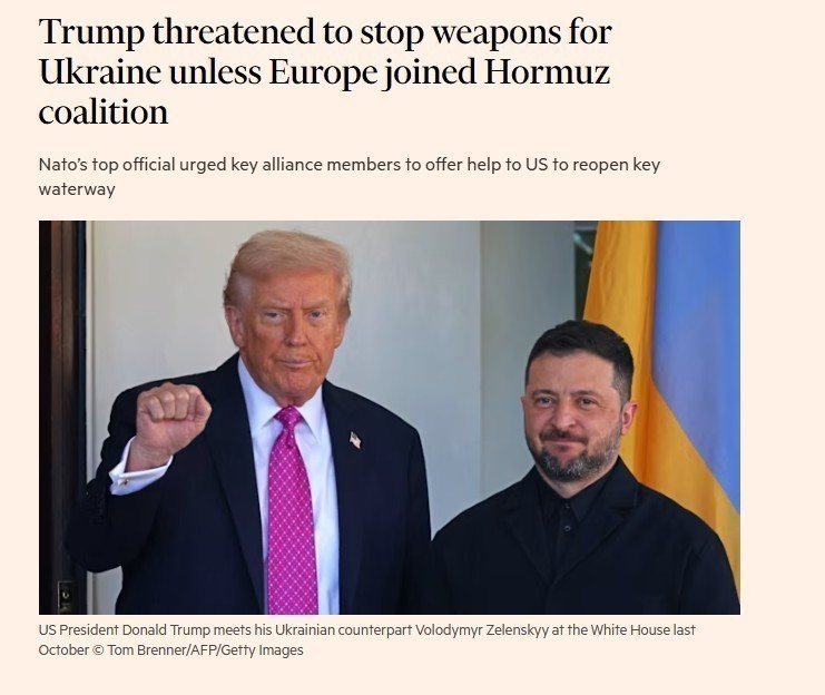 Ο Ντόναλντ Τραμπ φέρεται να απείλησε να τερματίσει την προμήθεια όπλων στην Ουκρανία, προκειμένου να ασκήσει πίεση στους Ευρωπαίους συμμάχους να συμμετάσχουν σε «συμμαχία των προθύμων» για την επαναλειτουργία των Στενών του Ορμούζ, αναφέρουν σε πρωτοσέλιδο δημοσίευμα τους οι Financial Times.