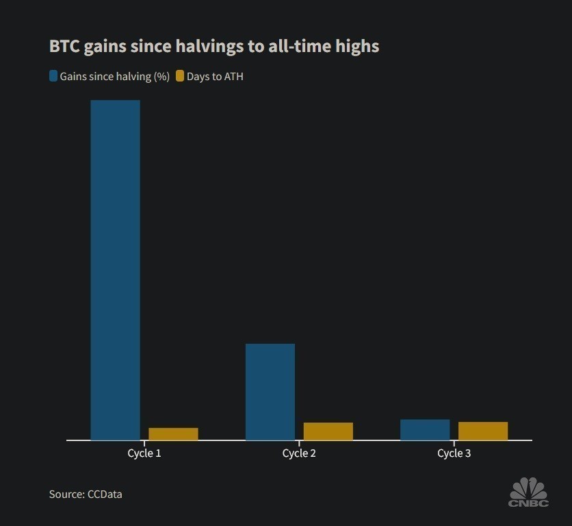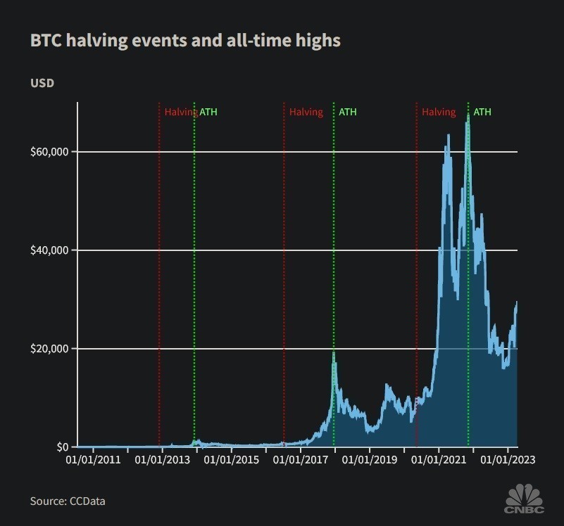 Σύμφωνα με το CNBC, τον Απρίλιο ή τον Μάιο του 2024, το bitcoin αναμένεται να βιώσει το επόμενό του «halving», αν και οι αναλυτές δε γνωρίζουν ακόμα την ακριβή ημερομηνία.