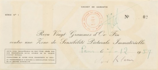 Ο Klein, προκειμένου να πιστοποιεί την ιδιοκτησία των έργων του, εξέδωσε ισάριθμες αποδείξεις, τις οποίες στη συνέχεια έδινε στους αγοραστές. Μία απ’ αυτές τις αποδείξεις περιήλθε στην κατοχή του Sotheby’s, ο οποίος προχώρησε στη σχετική δημοπρασία.