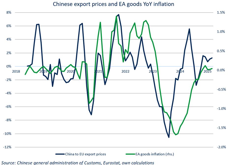 «Αυτό έχει σημαντικές επιπτώσεις στον πληθωρισμό της ζώνης του ευρώ (EA). Το γράφημα δείχνει τη μηνιαία μεταβολή στις τιμές των κινεζικών εξαγωγών προς την ΕΕ (μπλε γραμμή) και στα μη ενεργειακά αγαθά της Ευρωζώνης (πράσινη γραμμή). Τα κινεζικά δεδομένα προηγούνται κατά ένα μήνα. Η μεταβολή στις τιμές των κινεζικών εξαγωγών αντικατοπτρίζεται σε μεταβολή του πληθωρισμού αγαθών της Ευρωζώνης ένα μήνα αργότερα, με μια συχνά ασυνήθιστη συσχέτιση.