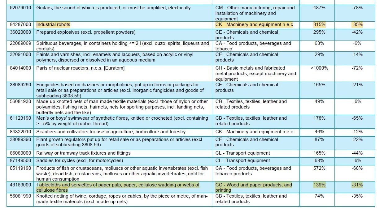Οι εισαγωγές βιομηχανικών ρομπότ αυξήθηκαν κατά 315%, σε συνδυασμό με μείωση τιμών κατά 35%. Και οι εισαγωγές σε ορισμένες ράβδους/μπάρες από κράμα χάλυβα αυξήθηκαν κατά πάνω από 1.000%, καθώς η τιμή τους μειώθηκε κατά 86%.