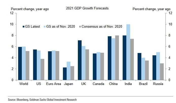 Συγκεκριμένα, οι αναλυτές υποστηρίζουν πως οι ανεπτυγμένες οικονομίες θα επιδείξουν γοργή ανάπτυξη μέχρι τα μέσα του 2022 η οποία θα ακολουθηθεί από μετριασμένη αναπτυξιακή πορεία. Όσον αφορά τις αναπτυσσόμενες αγορές, η έρευνα της Goldman Sachs υπογραμμίζει πως αναμένει επιβράδυνση της ανάπτυξης στην Κίνα λόγω των προβλημάτων στην αγορά ακινήτων και της τρέχουσας μακροοικονομικής πολιτικής.