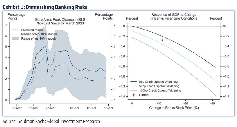 «Οι τραπεζικές εντάσεις έχουν υποχωρήσει τις τελευταίες εβδομάδες, καθώς ο κίνδυνος μιας απόλυτης τραπεζικής κρίσης στις ΗΠΑ μειώθηκε απότομα και τα μέτρα χρηματοδότησης των ευρωπαϊκών τραπεζικών μετοχών έχουν ανακτήσει μεγάλο μέρος της μεγάλης πτώσης τους στις αρχές Μαρτίου», αναφέρουν οι αναλυτές της Goldman Sachs σε ερευνητικό σημείωμα τη Δευτέρα.