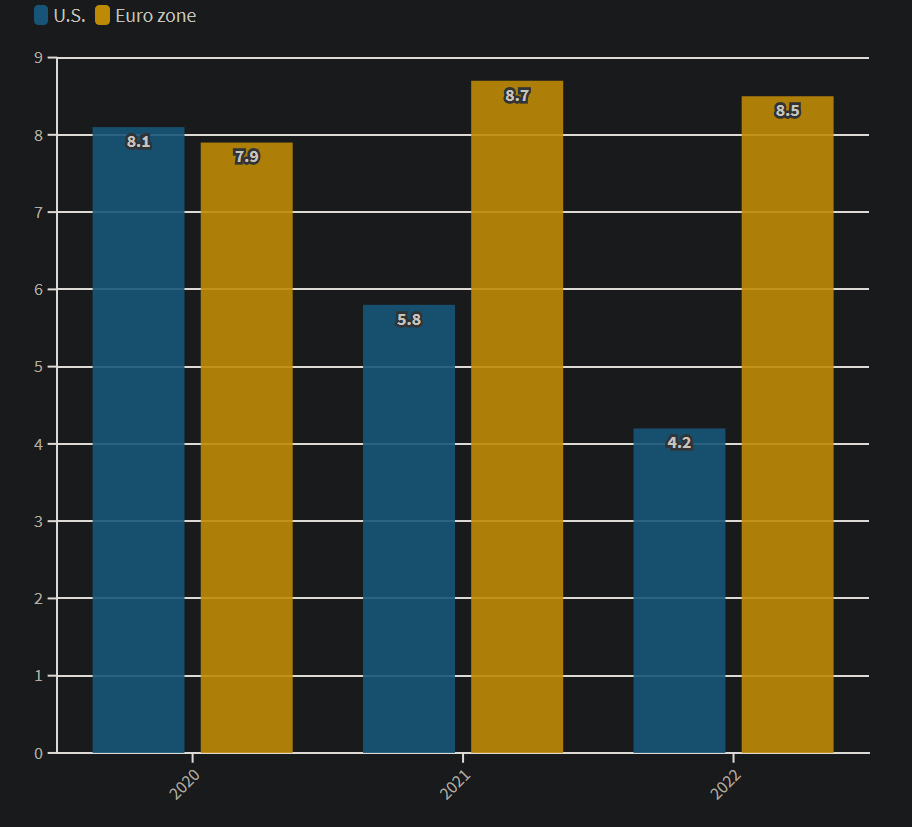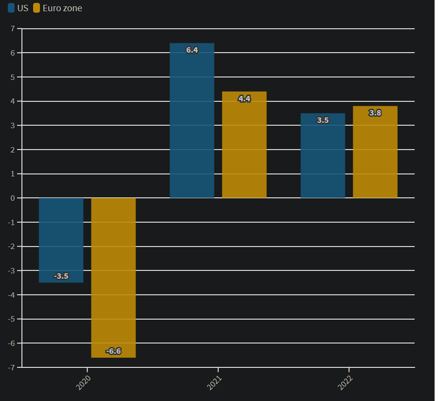 Οι ευρωπαϊκες χώρες, βάσει αυτών των δεδομένων, θα δυσκολευτούν πολύ πιο πολύ στο να ανακάμψουν το 2021. Το ΑΕΠ της ευρωζώνης αναμένεται να αυξηθεί κατά 4,4% φέτος, ενώ το ΑΕΠ των ΗΠΑ κατά 6,4%.