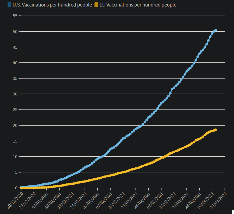 Ο Ζολτ Ντάρβας του βελγικού think-tank Βruegel μίλησε στο CNBC και ανέφερε πως το αμερικανικό πρόγραμμα εμβολιασμού ήταν «πολύ ισχυρότερο» από το αντίστοιχο ευρωπαϊκό. Γι αυτό και η αμερικανική οικονομία θα μπορέσει να “ανοίξει” πολύ πιο γρήγορα από την ευρωπαϊκή.