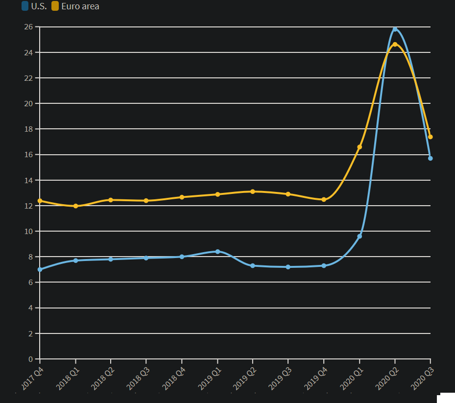 Στο τέλος του τρίτου τριμήνου του 2020, το μέσο ποσοστό αποταμίευσης στις ΗΠΑ βρισκόταν στο 15,7%. Αν και χαμηλότερα από το ρεκόρ του 25,8% στην αποκορύφωση της πανδημίας, είναι πολύ υψηλότερο από το αντίστοιχο ποσοστό πριν από το 2020.