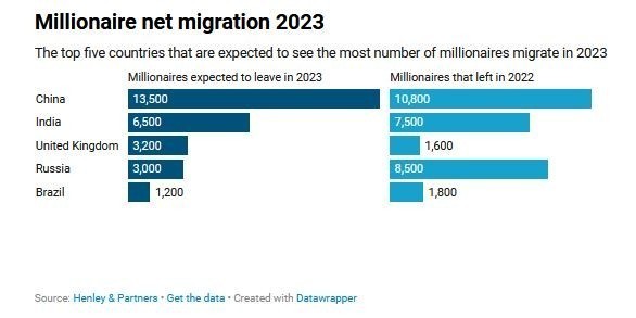 Tα στοιχεία της εταιρείας έδειξαν ότι το 2022 έφυγαν από την Κίνα 10.800 άνθρωποι με ιδιαίτερα μεγάλη καθαρή περιουσία, ενώ άλλοι 13.500 millionaires αναμένεται να φύγουν φέτος.