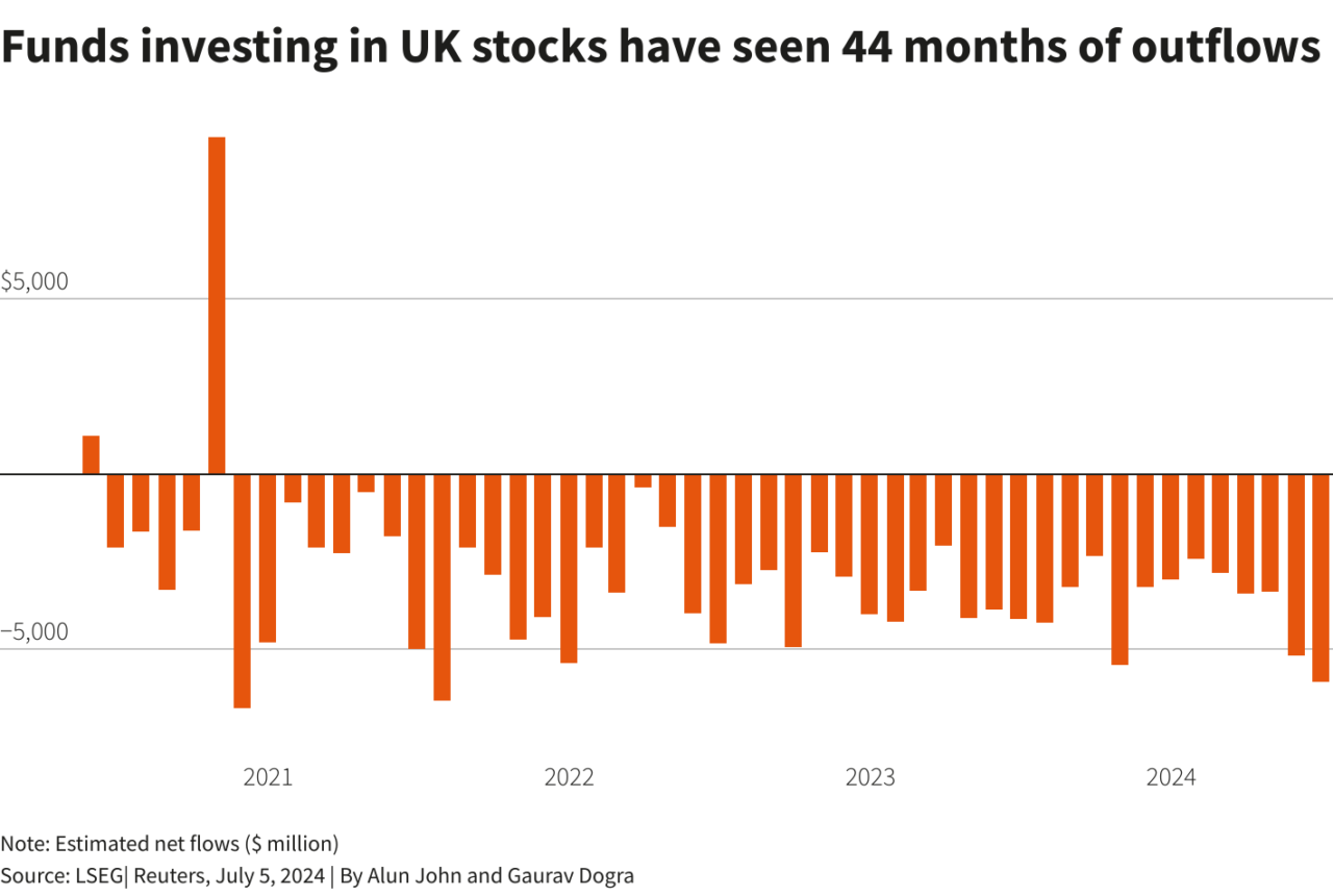 Οι επενδυτές συνέχισαν να αποσύρουν χρήματα από τα βρετανικά μετοχικά αμοιβαία κεφάλαια και τους χρηματιστηριακούς δείκτες μετά τις εκλογές της 4ης Ιουλίου, όπως έδειξαν τα ημερήσια στοιχεία του παρόχου πληροφοριών Lipper.