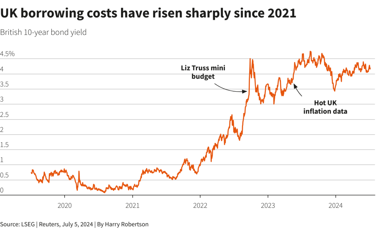 Τα αδύναμα δημοσιονομικά του Ηνωμένου Βασιλείου παραμένουν πηγή ανησυχίας, καθώς ο κρατικός δανεισμός πλησιάζει το 100% της οικονομικής παραγωγής, και το χάος στην αγορά του 2022 που εξαπέλυσε ο μίνι-προϋπολογισμός της συντηρητικής πρωθυπουργού Λιζ Τρας παραμένει νωπό στη μνήμη των επενδυτών.