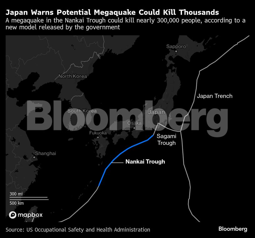 Πέρυσι η κυβέρνηση εξέδωσε προειδοποίηση για αυξημένο κίνδυνο μεγάλου σεισμού γύρω από την κοιλάδα Νανκάι, όπου η θαλάσσια πλάκα των Φιλιππίνων βυθίζεται κάτω από την ευρασιατική ηπειρωτική πλάκα, σύμφωνα με το Bloomberg.