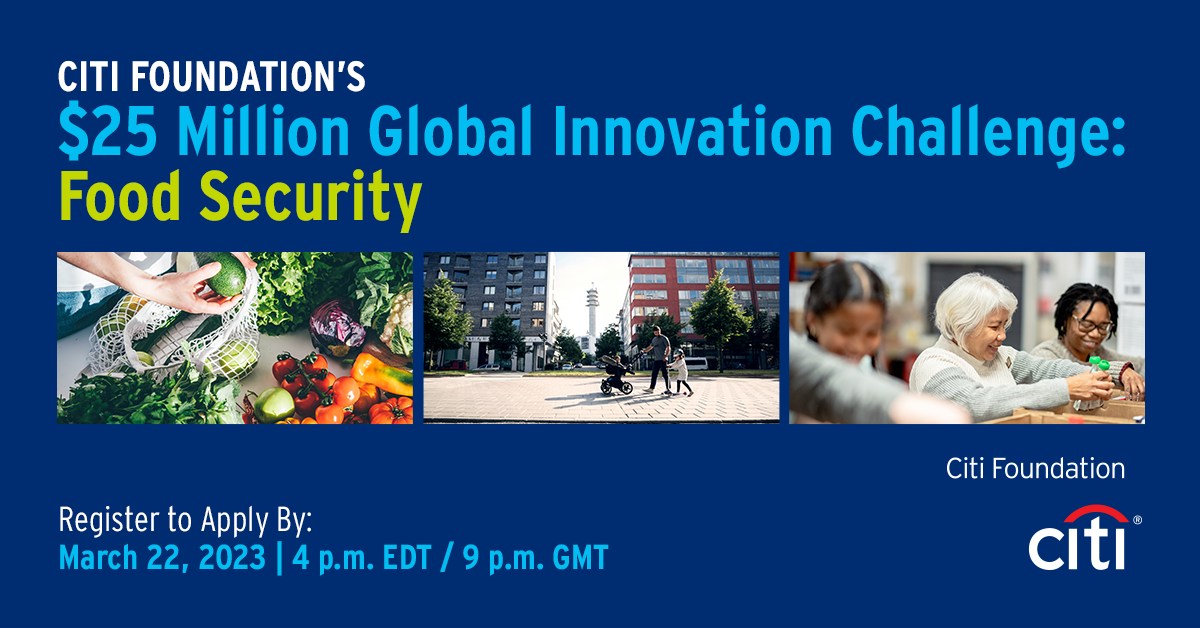 Παγκόσμια ανοικτή πρόσκληση για να βοηθήσει στην κλιμάκωση του αντίκτυπου των μη κερδοσκοπικών οργανισμών σε όλο τον κόσμο που αναπτύσσουν καινοτόμες λύσεις για τη βελτίωση της επισιτιστικής ασφάλειας απευθύνει το Ίδρυμα Citi.