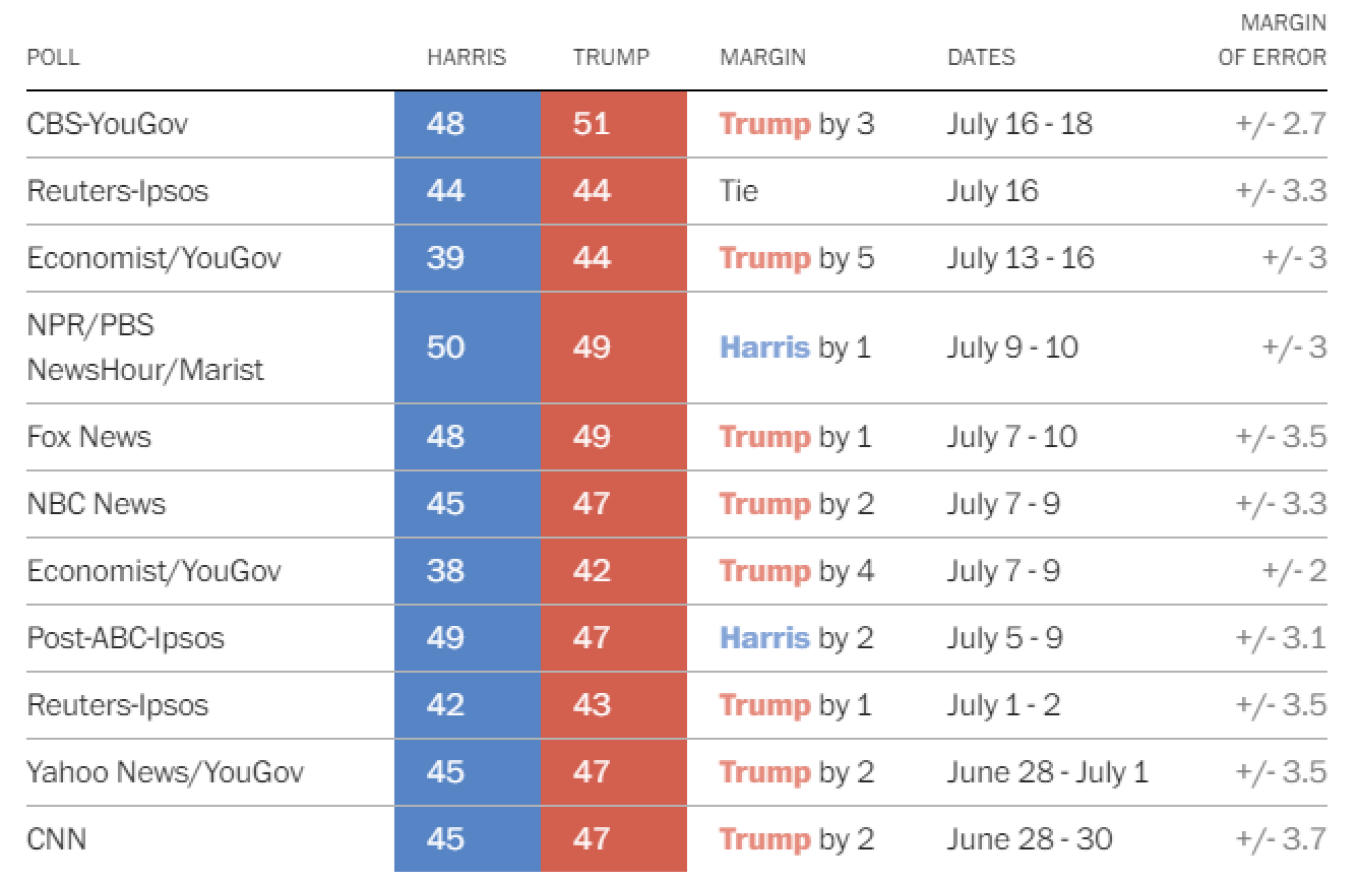 Το protothema.gr αναφέρεται σε ανάλυση της αμερικανικής εφημερίδας Washington Post η οποία επιχειρεί να απαντήσει στο παραπάνω ερώτημα παραθέτοντας στοιχεία από πρόσφατες δημοσκοπήσεις. Σε μέσο όρο 11 δημοσκοπήσεων που διενεργήθηκαν μετά το ντιμπέιτ της Washington Post, ο Τραμπ υπερτερεί της Χάρις κατά 1,5 ποσοστιαία μονάδα, ελάχιστα λιγότερο από το προβάδισμά του κατά 1,9 μονάδες έναντι του Μπάιντεν στις ίδιες δημοσκοπήσεις.