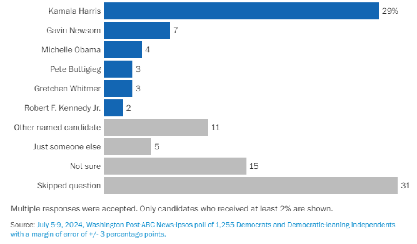 Ερώτηση: Εάν ο Μπάιντεν αποχωρήσει, ποιος πιστεύετε ότι θα έπρεπε να είναι ο υποψήφιος των Δημοκρατικών για την προεδρία στη θέση του; (Μεταξύ των Δημοκρατικών και των ανεξάρτητων που τείνουν προς το Δημοκρατικό Κόμμα σε μια ερώτηση ανοικτού τύπου)