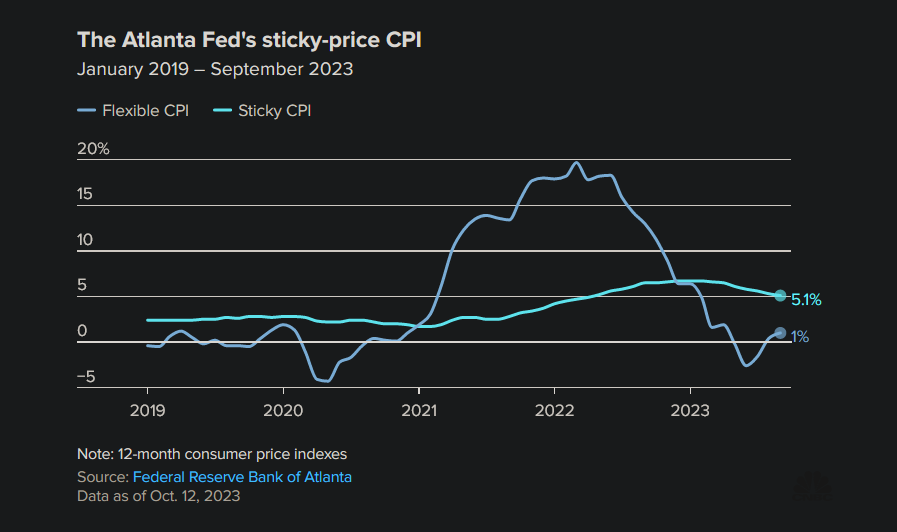 Ο πληθωρισμός των «αυξημένων τιμών» όπως τα ενοίκια, οι υπηρεσίες, το κόστος ασφάλισης, κυμάνθηκε στο 5,1% τον Σεπτέμβριο, μειωμένος κατά 1% από τον Μάιο, σύμφωνα με την Fed του Κλίβελαντ. Ο ελαστικός ΔΤΚ ο οποίος συμπεριλαμβάνει τα τρόφιμα, την ενέργεια, το κόστος των αυτοκινήτων και τον ρουχισμό, βρέθηκε στο 1%. Αν και βελτιωμένοι, κανένας από τους δύο δείκτες δε δείχνει ολοκλήρωση της προσπάθειας.