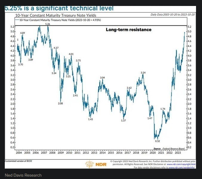 Η απόδοση του 10ετούς κρατικού ομολόγου έχει καταγράψει σημαντική αύξηση φέτος, επιτυγχάνοντας υψηλό δεκαετίας στο 5,02% την περασμένη Δευτέρα. Περαιτέρω αύξηση θα μπορούσε να απειλήσει την οικονομία, ιδιαίτερα εάν ξεπεράσει το 5,25%.
