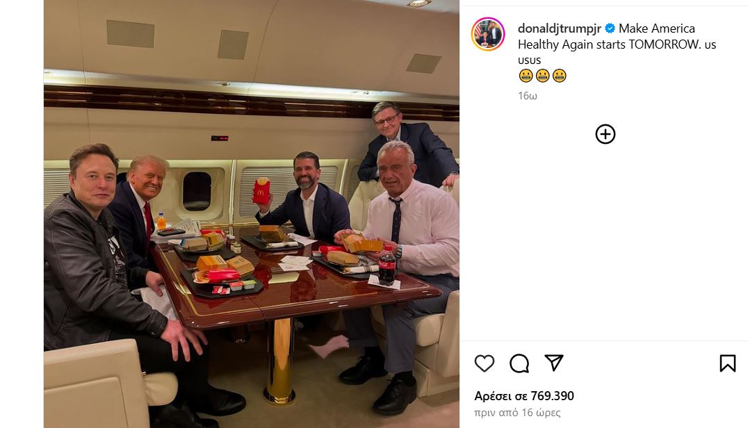 «Το να ξαναδώσουμε στην Αμερική την υγεία της αρχίζει από ΑΥΡΙΟ», ήταν η λεζάντα που έβαλε, μάλλον αποπειρώμενος να κάνει χιούμορ, ο Ντόναλντ Τραμπ ο νεότερος, ο μεγαλύτερος γιος του μεγιστάνα, στη φωτογραφία που μεταφόρτωσε στο Instagram από το δείπνο αυτό, πάνω στο αεροσκάφος του πατέρα του, με παρόντες επίσης τον δισεκατομμυριούχο Έλον Μασκ καθώς και τον πρόεδρο της απερχόμενης Βουλής των Αντιπροσώπων, τον Μάικ Τζόνσον.