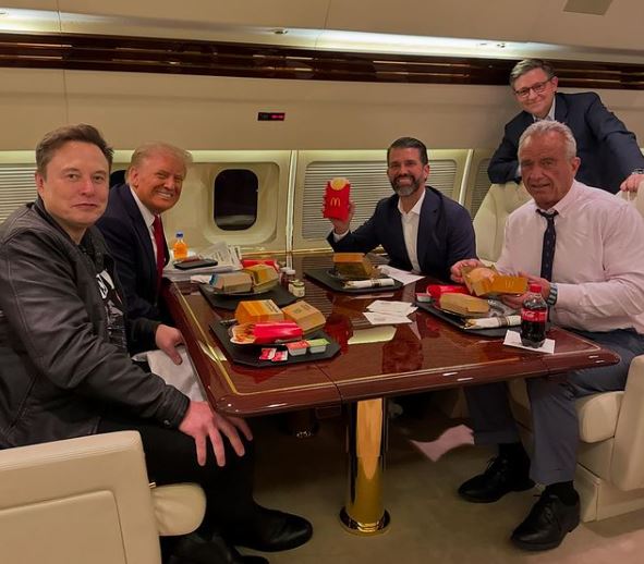 «Το να ξαναδώσουμε στην Αμερική την υγεία της αρχίζει από ΑΥΡΙΟ», ήταν η λεζάντα που έβαλε, μάλλον αποπειρώμενος να κάνει χιούμορ, ο Ντόναλντ Τραμπ ο νεότερος, ο μεγαλύτερος γιος του μεγιστάνα, στη φωτογραφία που μεταφόρτωσε στο Instagram από το δείπνο αυτό, πάνω στο αεροσκάφος του πατέρα του, με παρόντες επίσης τον δισεκατομμυριούχο Έλον Μασκ καθώς και τον πρόεδρο της απερχόμενης Βουλής των Αντιπροσώπων, τον Μάικ Τζόνσον.