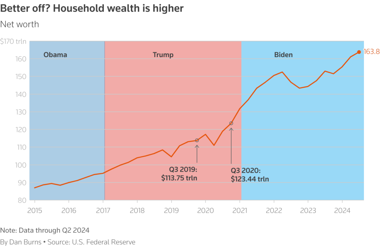 Δεν επενδύουν όλοι οι Αμερικανοί στο χρηματιστήριο και δεν κατέχουν όλοι δική τους κατοικία. Αλλά για όσους το κάνουν, τα χρόνια μετά την πανδημία υπό τον Μπάιντεν προσέθεσαν σταθερά στον πλούτο των νοικοκυριών.